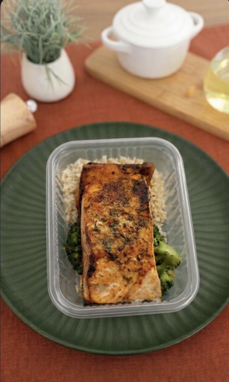 Salmão grelhado + brócolis salteado + arroz integral