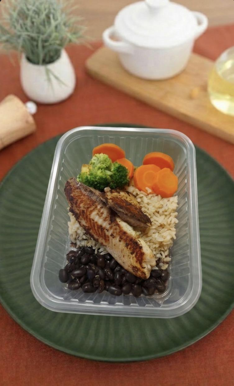 Tilápia grelhada + leg ao vapor + arroz integral + 50g de feijão