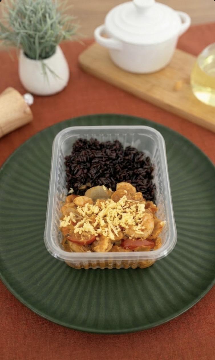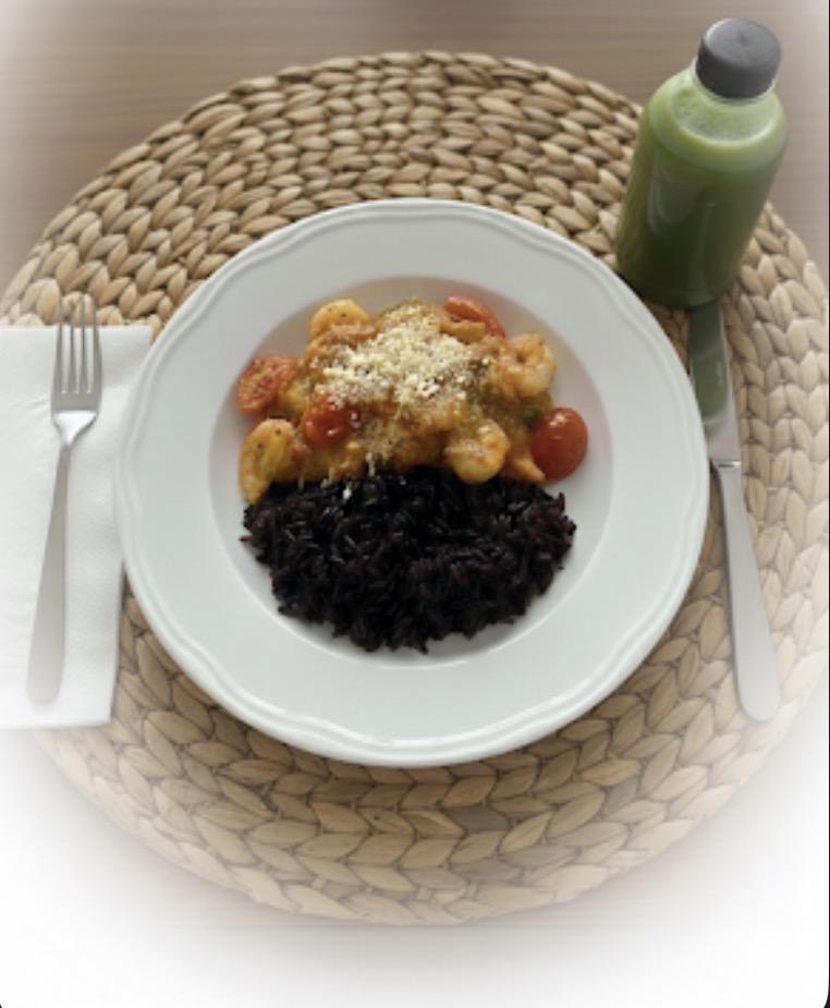 Dieta perca de peso: 270g ( 100g arroz negro + 170g camarões frescos refogados com tomate frescos e cebola em média.)