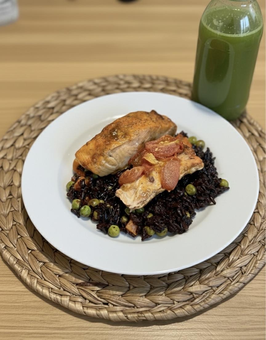 Salmão ao m. Mediterrâneo c/ arroz negro à grega