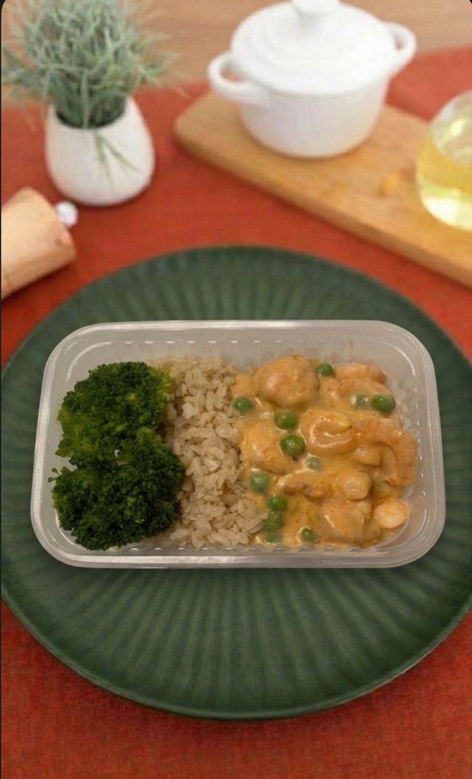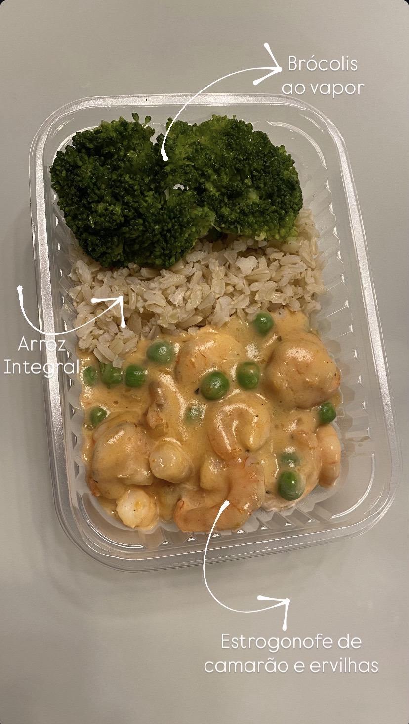 Estrogonofe de camarão c/ ervilhas + brócolis + arroz integral