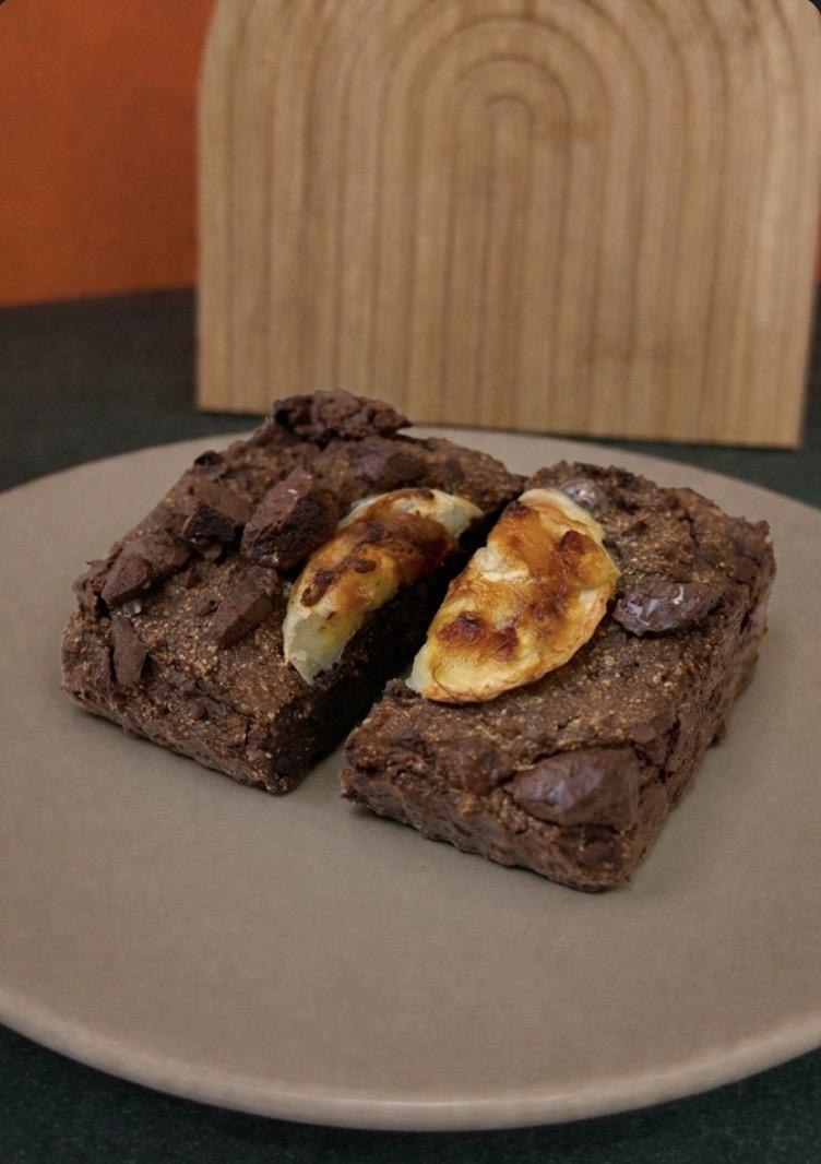FEITO COM: banana, fermento,, pedaços de chocolate meio amargo, ovos, manteiga O lactose e chocolate em pó 70%.
